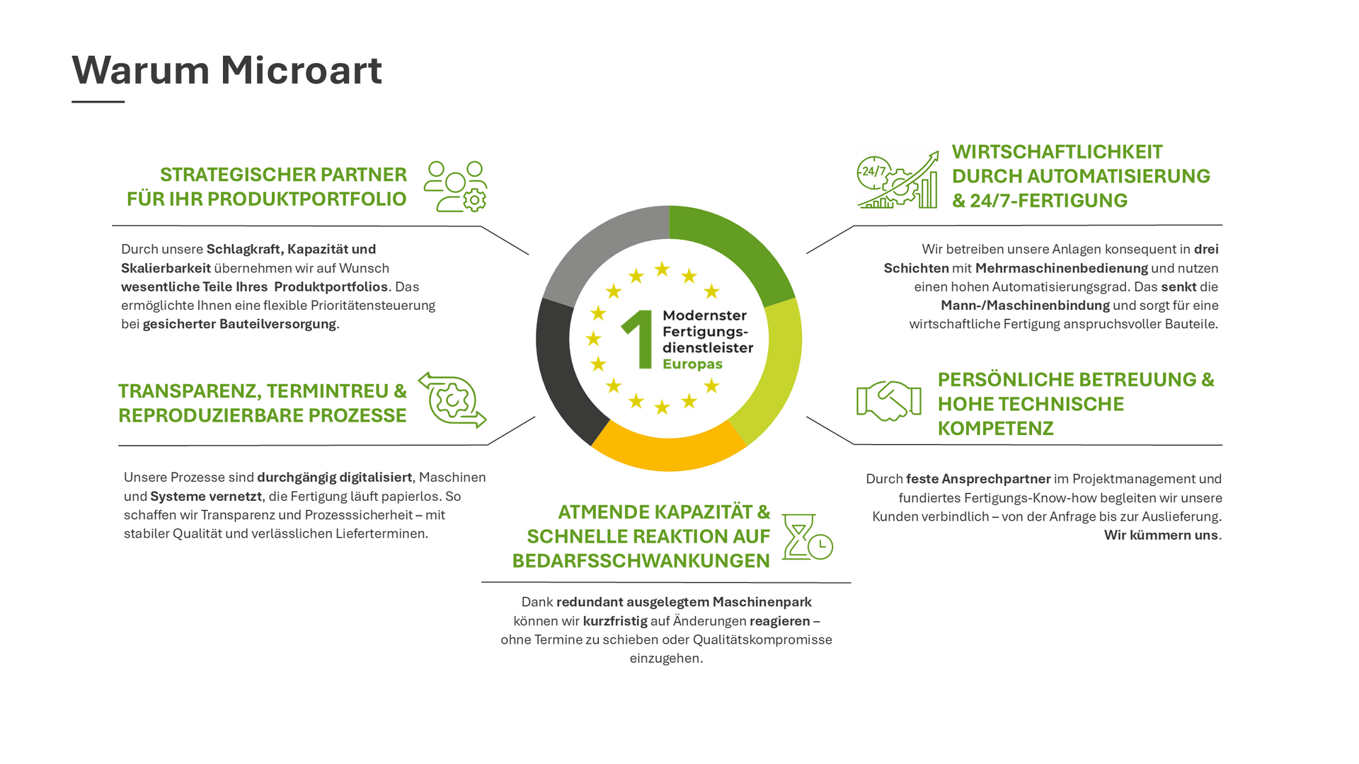 Microart ist der modernste Fertigungsdienstleister Europas und einer der am schnellsten wachsenden Zerspanungsdienstleister in Deutschland. Als Fertigungsdienstleister der Industrie 5.0 liefern wir unseren Kunden komplexe Präzisionsteile und wirtschaftliche Systemlösungen just-in-time.